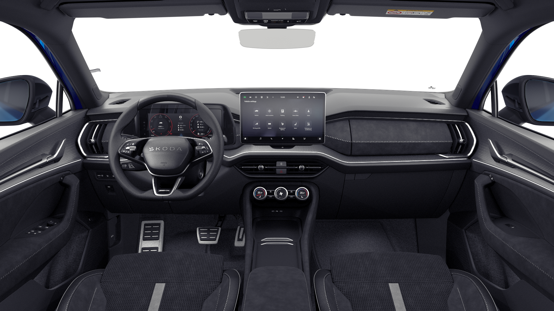 N0L | Design Interior SPORTLINE contine: -tapiterie de Suedia/Piele art. -scaune fata Sport cu tetiere integrate -decor plansa de bord Suedia -tapiterie plafon de culoare neagra -pedalier cu design sport -ornamente praguri interioare usi fata -iluminare spatiu pentru picioare fata/spate |